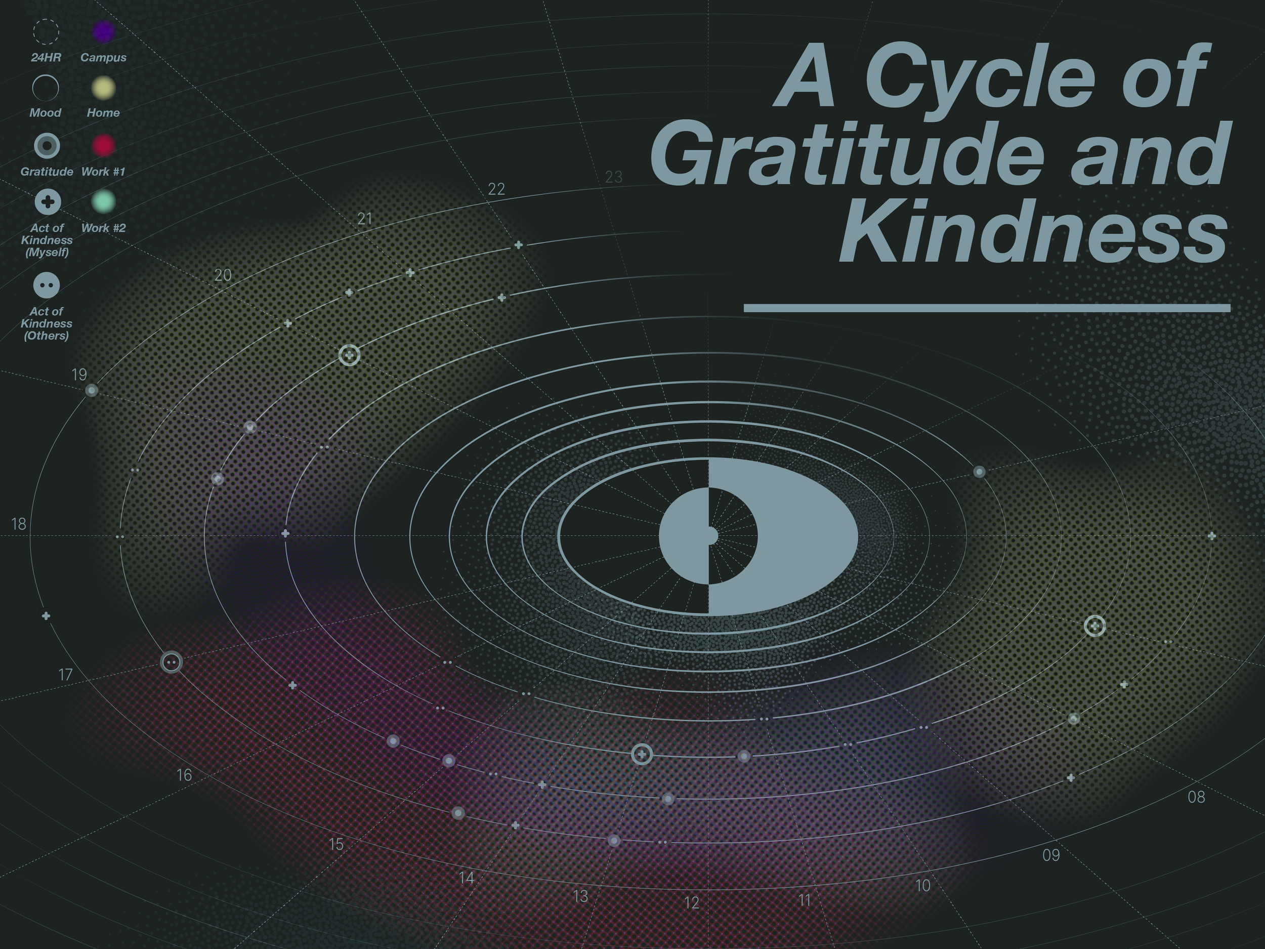 A Cycle of Gratitude and Kindness is a data visualization graphic that maps the patterns of gratitude and kindness in daily life. By tracking when and where specific activities occur most frequently, this visualization reveals meaningful trends in behavior and interaction.